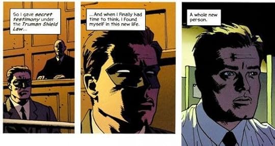 Once the good guys have rounded up the bad guys in the superhero books they usually wind up somewhere like Arkham Asylum (Batman) or sent into space in a mirror (Superman 2), but in this book Ed Brubaker has his villain wind up in a Witness Relocation Program and given a job as a file clerk. There he lives a normal life of boredom, his super powers regulated by drugs administered by the good guys (a kind of less glamorous JLA). But the life he lived is too alluring and he soon finds his ways back to old life.
