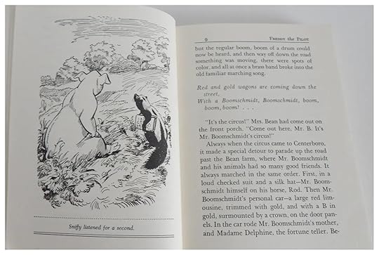 Brooks has an appealing vision of animals. They are at least as interesting and intelligent as his human characters; they can all talk and should be treated with respect; they like doing things people do (e.g., flying planes, reading Robin Hood, and parachuting); they do retain their animal lives/habits/characteristics etc. (though this book has less of that kind of thing than most of the previous ones, as, for instance, the skunks never use their distinctive scent defense); people like Mr. Boomschmidt and Mr. Bean who treat animals well are good, people who mistreat them bad (Mr. Boomschmidt uses cages just for animals to sleep in and the animals are performers and run the circus at least as much as the people do).