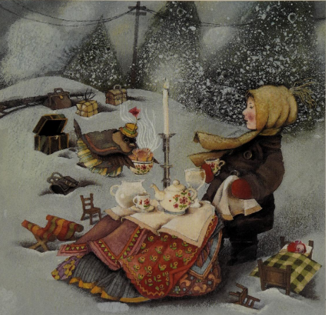 A story of friendship with whimsicality. Bess is a young white girl out in the snow with her doll, wondering if she'll ever find a friend to play with. Out from the sky tumbles Bella (a bird) who apparently had spent too much time packing to fly south for the winter and had therefore been flying in the stormy sky. When she sees Bess' tea (with only crumbs) she unpacks her suitcases full of tea and jam. Some dogs on a firetruck come by, along with a family of mice. Eventually Bess' mom calls her inside (due to the snow falling), and Bess brings Bella home to stay for the winter.