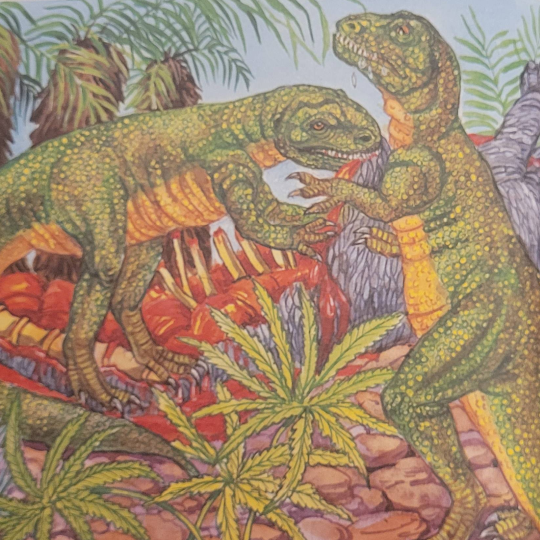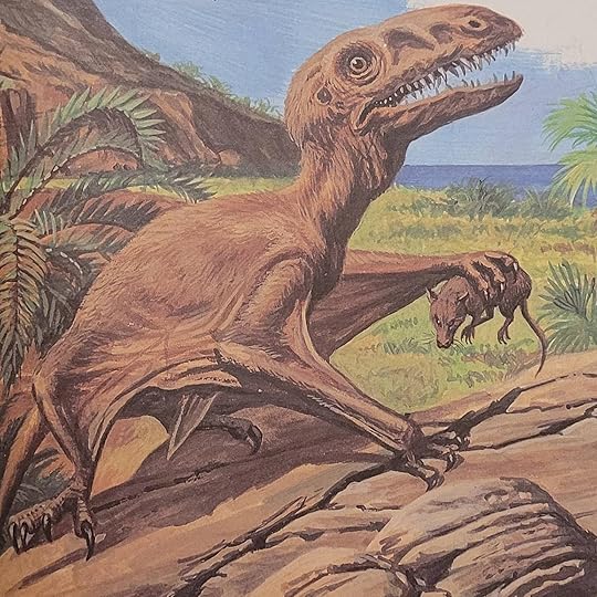 Rather than a field guide, this is a group of illustrated xenofiction stories, each centred around a different dinosaur mesozoic archosaur DIAPSID, notably not including T. rex. Each story follows its subject during a brief episode in life, interacting with other species and struggling to survive. The selection mixes "classic" animals like Allosaurus, Brontosaurus (valid name btw) and Triceratops, with more unusual choices like Dimorphodon and Mamenchisaurus. Strangely, it doubles up on two sauropods and two ceratopsians. The last few pages feature a non-fiction section with skeletons of each animal featured.