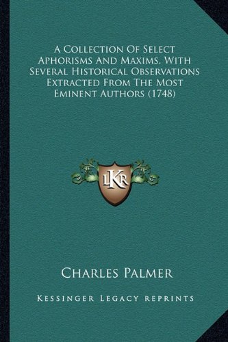 ""A Collection Of Select Aphorisms And Maxims, With Several Historical Observations Extracted From The Most Eminent Authors"" is a book written by Charles Palmer in 1748. This book is a compilation of wise sayings and observations from some of the most renowned authors in history. The aphorisms and maxims are carefully selected and organized by Palmer to provide readers with a comprehensive guide to life's most important lessons. The book also includes several historical observations that provide context and insight into the meaning of the aphorisms and maxims. This book is an excellent resource for anyone looking to gain a deeper understanding of life's most important truths and how to apply them to their own lives. It is a timeless classic that continues to inspire and educate readers to this day.This scarce antiquarian book is a facsimile reprint of the old original and may contain some imperfections such as library marks and notations. Because we believe this work is culturally important, we have made it available as part of our commitment for protecting, preserving, and promoting the world's literature in affordable, high quality, modern editions, that are true to their original work.