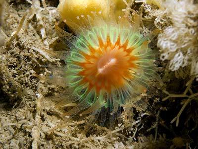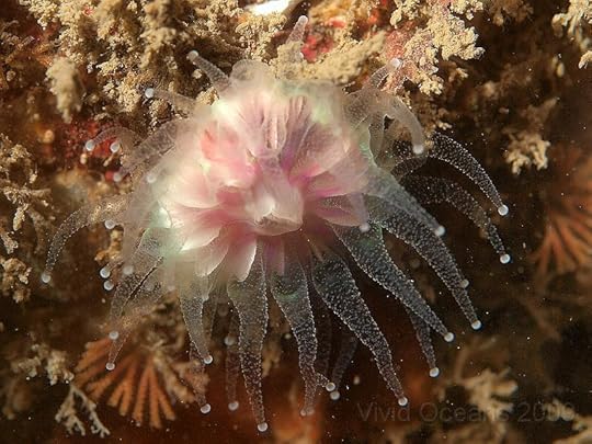 “its cup is fringed with exquisitely formed pale brown tentacles with white tips. Inside this cupped cavity there is an oval disc marked with a zig-zag and in the centre of the ring is a mouth, a white crenulated slit. It is almost all mouth – a mouth like a still eye at the centre of its tentacle-pulsing storm”.