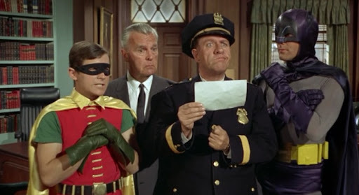 Batman: Look, a pair of jokingriddles! Chief O'Hara: What does a turkey do when he flies upside down? Robin: He gobbles up! Commissioner Gordon: What weighs six ounces, sits in a tree, and is very dangerous? Robin: A sparrow with a machine gun! Batman: Obviously. So let's combine these answers. What kind of creature would gobble up a bird in a tree? O'Hara: Mother of mercy! A cat! Batman: Yes. The criminal catalyst in this affair, the Catwoman! Gordon: Riddler, Joker, Penguin, and the Catwoman too. The sum of the angles of that rectangle is too monstrous to contemplate! Batman: We've been given the plainest warning. They're working together to take over... the entire world!