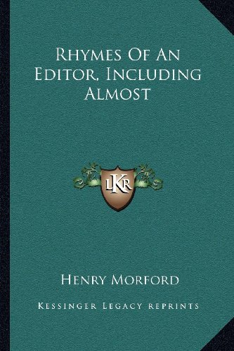 ""Rhymes of an Editor, Including Almost"" is a collection of poems written by Henry Morford, a journalist and editor from the late 19th century. The book contains a variety of poems, ranging from humorous and lighthearted to more serious and contemplative. Many of the poems reflect on the experience of being a writer and editor, exploring themes such as creativity, inspiration, and the challenges of the publishing industry. Other poems touch on more universal themes such as love, loss, and the beauty of nature. Morford's writing style is characterized by a lively and engaging use of language, with clever wordplay and rhymes that make the poems fun to read and recite. Overall, ""Rhymes of an Editor, Including Almost"" is an entertaining and thought-provoking collection of poetry that will appeal to readers who enjoy both light verse and more serious literature.This scarce antiquarian book is a facsimile reprint of the old original and may contain some imperfections such as library marks and notations. Because we believe this work is culturally important, we have made it available as part of our commitment for protecting, preserving, and promoting the world's literature in affordable, high quality, modern editions, that are true to their original work.