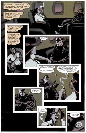 All this sounds like way escapist fun, adult comix sex and violent, I suppose, but really, I think this kind of playing around/invention isn’t fundamentally at the heart of any Brubaker story. It’s about morality and identity and politics (ever wonder who really runs the world, the “they” people always refer to? Tao has inside connections with them). And some great ideas: What do these folks in the Tao organization do in their free time, besides drink? They tell each other their origin stories! Ms. Misery’s is the most chilling, but they are all great, and this idea is so great, right?