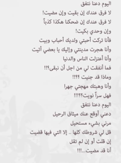 اليوم دعنا نتفق لا فرق عندك إن بقيت وإن مضيت لا فرق عندك إن ضحكنا هكذا - كذبا ! وإن وحدي بكيت فأنا تركت أحبتي ولديك أحباب وبيت وأنا هجرت مدينتي وإليك يا بعضي أتيت وأنا اعتزلت الناس والطرقات والدنيا فما أنفقت لي من أجل أن نبقى؟ وماذا قد جنيت ؟ وأنا وهبتك مهجتي جهراً فهل سراً نويت؟