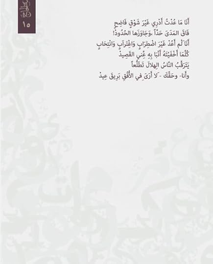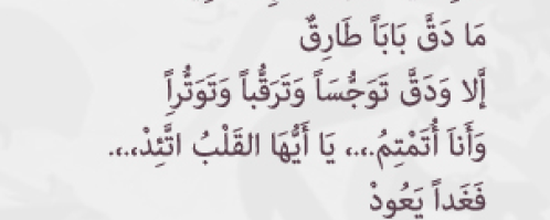 " أولست أنت من استراح بباحة القلب الرحيب؟ أولست من لرحيله .. باتت هويته غريب؟ أو ليس حرفك أنت أغنية؟ يرددها الصباح كأنها تعويذة .. ويعيدها عند المغيب؟"