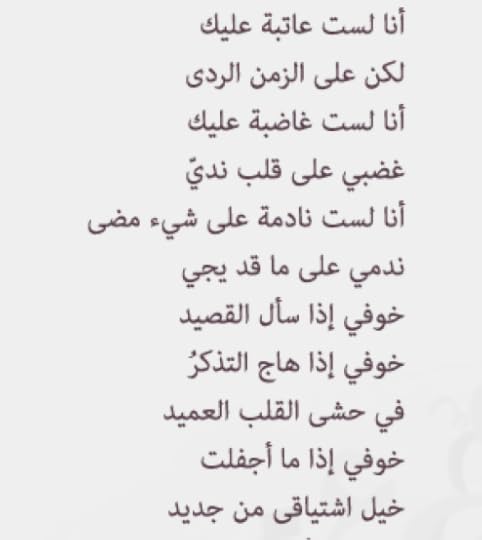"أنا قد تعبت ولم يعد فى العمر ما يكفى الجراح أنفقت كل الصبر عندك والتجلّد والتجمّل والسَماح أنا ما تركت لمقبل الايام شئ إذ ظننتك آخر التّطوف فى الدنيا فسَرّحَت المراكب كلها وقصصتَ عن قلبي الجناح انا لم إعد أقوى وموعدنا الذى قد كان راح"