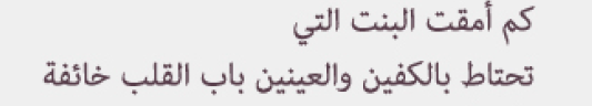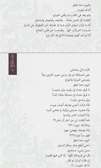 “واليوم دعنا نتفق أنا قد تعبتْ.. ولم يعد في القلب مايكفي الجراح أنفقتُ كلَّ الصبرِ عندكَ.. والتجلدَ والتجملَ والسماحْ ... أنا ماتركتُ لمقبل الأيام شيئاً إذْ ظننتُكَ آخرَ التطوافِ في الدنيا فسرَّحْتُ المراكبَ كلَّها..وقصَصْتُ عن قلبي الجناحْ ... فـاردُدْ إليَّ بضاعتي بَغْيُ انصرافكَ لم يزلْ يدمي جبين تكبُّري زيفاً يجرعني المرارةَ والنُّواح”