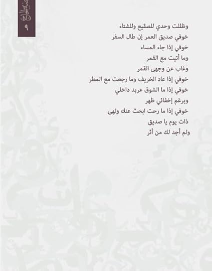 "وغدًا ستسألني القصائد عنك والليل الطويل وغدًا ستسألني المرائي عندما يأتي الاصيل سأقول سافر كالمساء وظللت وحدي للصقيع وللشتاء خوفي صديق العمر ان طال السفر خوفي إذا جاء المساء وما أتيت مع القمر وغاب عن وجهي القمر خوفي إذا عاد الخريف وما رجعت مع المطر خوفي إذا ما الشوق عربد داخلي وبرغم إخفائي ظهر خوفي إذا مارحت ابحث عنك ولهى ذات يوم ياصديق ولم أجد لك من أثر"