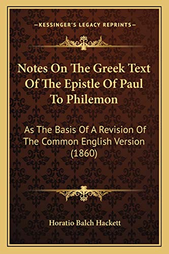 ""Notes On The Greek Text Of The Epistle Of Paul To As The Basis Of A Revision Of The Common English Version"" is a book written by Horatio Balch Hackett in 1860. The book is a detailed analysis of the Greek text of the Epistle of Paul to Philemon, with the aim of revising the Common English Version. The author provides a thorough examination of the original Greek text, including its grammar, syntax, and vocabulary. Hackett also provides historical and cultural context to aid in understanding the meaning of the text. The book serves as a valuable resource for scholars and students of Biblical studies, as well as anyone interested in the history and interpretation of the Bible.And A Revised Version, With Notes.This scarce antiquarian book is a facsimile reprint of the old original and may contain some imperfections such as library marks and notations. Because we believe this work is culturally important, we have made it available as part of our commitment for protecting, preserving, and promoting the world's literature in affordable, high quality, modern editions, that are true to their original work.