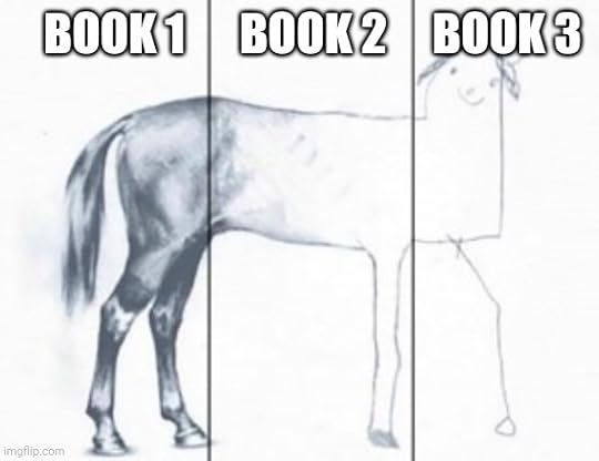 Idk I had high hopes throughout books 1 and 2 and started losing faith about 80% of the way in book 3 but I kept on reading just to see what happened. The only good thing is that it made me closer to my reading goal, so...