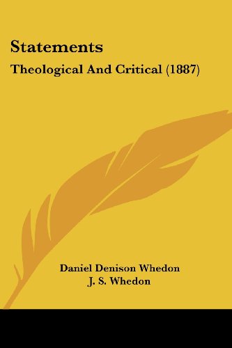 Statements, theological and critical This book, "Statements, theological and critical," by D.D. Whedon, is a replication of a book originally published before 1887. It has been restored by human beings, page by page, so that you may enjoy it in a form as close to the original as possible.