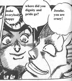 Es en momentos en los que Josuke se pone a trazar planes demasiado beneficiosos usando trampas que me recuerda a su papá ♥ Dicen que Josuke saco el mal caracter de su madre, pero siendo honestos le veo más parecido a Joseph xD
