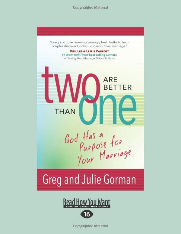 What is God's specific big idea for your marriage? You and your spouse are as unique as God is creative. He designed you with distinction. His fingerprints are all over your lives. The day you married, God joined you for a purpose and destined you, together, for greatness. But what causes some couples to thrive and others to merely survive in marriage? Is your marriage purpose-focused or problem-focused? In Two Are Better than One, Greg and Julie Gorman share exhilarating insights and hands-on resources to lead you on an exciting journey of discovering God's plan for your marriage. When fully embraced by both husband and wife, these truths will heal, restore, and deepen intimacy in every marriage. Yes, in every marriage, no matter the condition of the relationship. You'll laugh at their fresh twist on some of your favorite Bible heroes and be surprised by many aha moments as they provide the pathway to uncover God's big idea for your marriage. Join the movement (#marriedforapurpose) and experience the powerful truth that two are better than one.