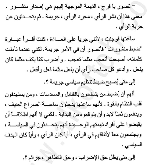 لكني لا أفهم إطلاقاً أن يقبضوا على أفراد تهمتهم الوحيدة أنهم يتحدثون في السياسة! ويجتمعون معا لاتفاقهم في الرأي، أيا كان الرأي وأيا كان الهدف السياسي.. إلي متي يظل حق الإضراب وحق التظاهر جرائم؟