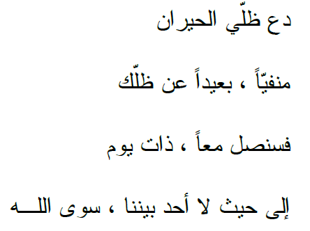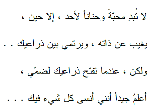 "و الآن ، إن الضيف المتطفل.. المطرود من العتبات جميعها، و الذي انهكه التعب.. يركن إليها بعينيه الدافئتين النائمتين.. آه، علي أن أصوغ له قالبًا من مرّ العتاب.. فيغني الثمل في كؤوس الخمر: هل ما يزال ثمة شراب، في حانة شفتيك العذبتين؟ أم من أجل عابر السبيل، المنهك، في قلب هذه الحجرة، المفعمة عطرًا و جمالاً فسحةٌ لإغفاءة!"