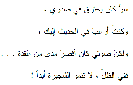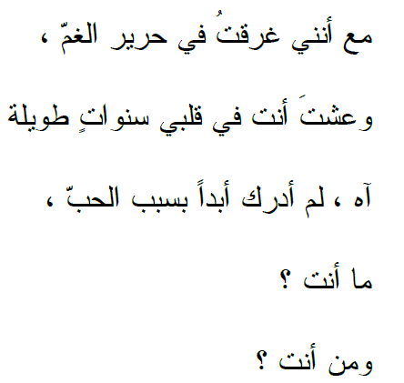 "حين كشفت النقاب عن شاطئ صدرك.. وجدت في قلبك أنني حبيبتك.. 'يا لدهشتي، فلقد جهلت منذ البداية ' وجاء يوم كنت فيه عذاب قلبك..
