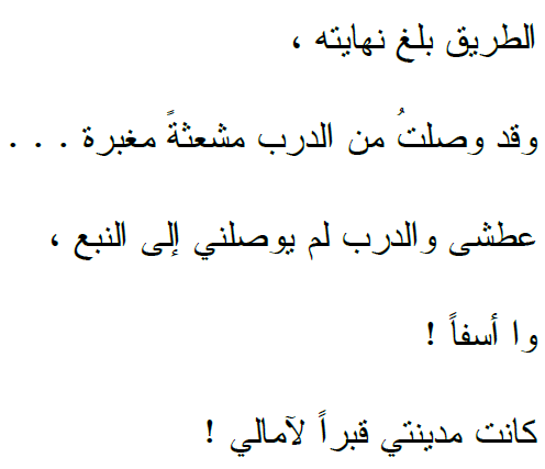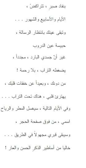 اتحرر من نفسي وابقى اسيرتها وكل ما يبقى تطوله يد الخراب وتصبح روحي كشراع السفينة بعيدة تخفيها الافاق بنفاذ صبر تتراكض الايام والاسابيع والشهور وتبقى عينك بانتظار الرسالة حبيسة عين الدروب