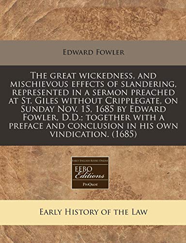 The great wickedness, and mischievous effects of slandering, represented in a sermon preached at St. Giles without Cripplegate, on Sunday Nov. 15, 1685 by Edward Fowler, D.D. ; together with a preface and conclusion in his own vindication. Fowler, Edward, 1632-1714. [16], 28 p. London : Printed for Brabazon Aylmer ..., 1685. Arber's Term cat. / II 143 Wing / F1707 English Reproduction of the original in the Cambridge University Library