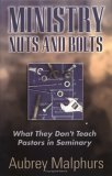Practical and Applicable In "Ministry Nuts and Bolts," Aubrey Malphurs breaks down ministry into four foundational concepts. They are: (1) core values; (2) mission; (3) vision; and (4) strategy. Each of these areas needs to be defined. Then they need to become the focus of the church. He spends the rest of the book developing a ministry strategy based on these foundational concepts. His strategy is based on discipleship and ministering to the community taking in factors such as ministry setting and finances. This is a great book for pastors, church planters, and ministry leaders.