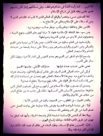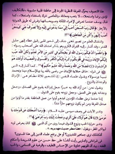 يقول ذو النون المصري : الأنس بالله نور ساطع، والأنس بالناس سم قاطع ، الشوق اعلى الدرجات والمقامات إذا بلغه العبد استبطأ الموت شوقا الى ربه ، وحبا فى اللقاء والنظر إليه . كلما شكوت من قسوة قلبى وتلك الوحشه التى لا نعرف لها سبب الا البعد عن الله هرعت لهذا الكتاب ، هذا الكتاب له فائدتان بالنسبة لى : الاولى : تصحيح مفاهيم مغلوطة كثيرة خاصه بمقام الألوهية والربوبية ، تهذيب النفس وتربيتها حتى لا تسئ الادب فى التعامل مع المولى عز وجل ، وقد اثبت فاعلية كبيرة ، الثانية : محاولة لترقيق قلب قسته الذنوب والخطايا ، وكبلته الدنيا و زينتها ، والنفس وسلطانها :