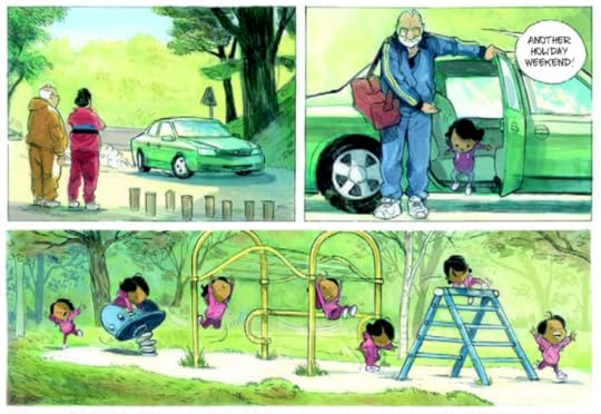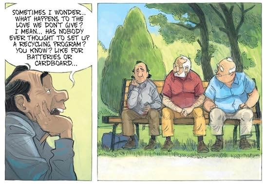 “Sometimes I wonder … What happens to the love we don’t give? I mean… Has nobody ever thought to set up a recycling program? You know? Like for batteries or cardboard…”This was simply wonderful. Sweet, lovely, and so beautifully sad but yet strangely hopeful. That’s Zidrou in a nutshell, it seems. And I loved it so much, even if it still makes me a bit sad thinking about it. Zidrou just knows how to hit you right in the emotions, but not manipulatively so, somehow keeping it real and fresh and sweet while never venturing anywhere near sentimentality territory.