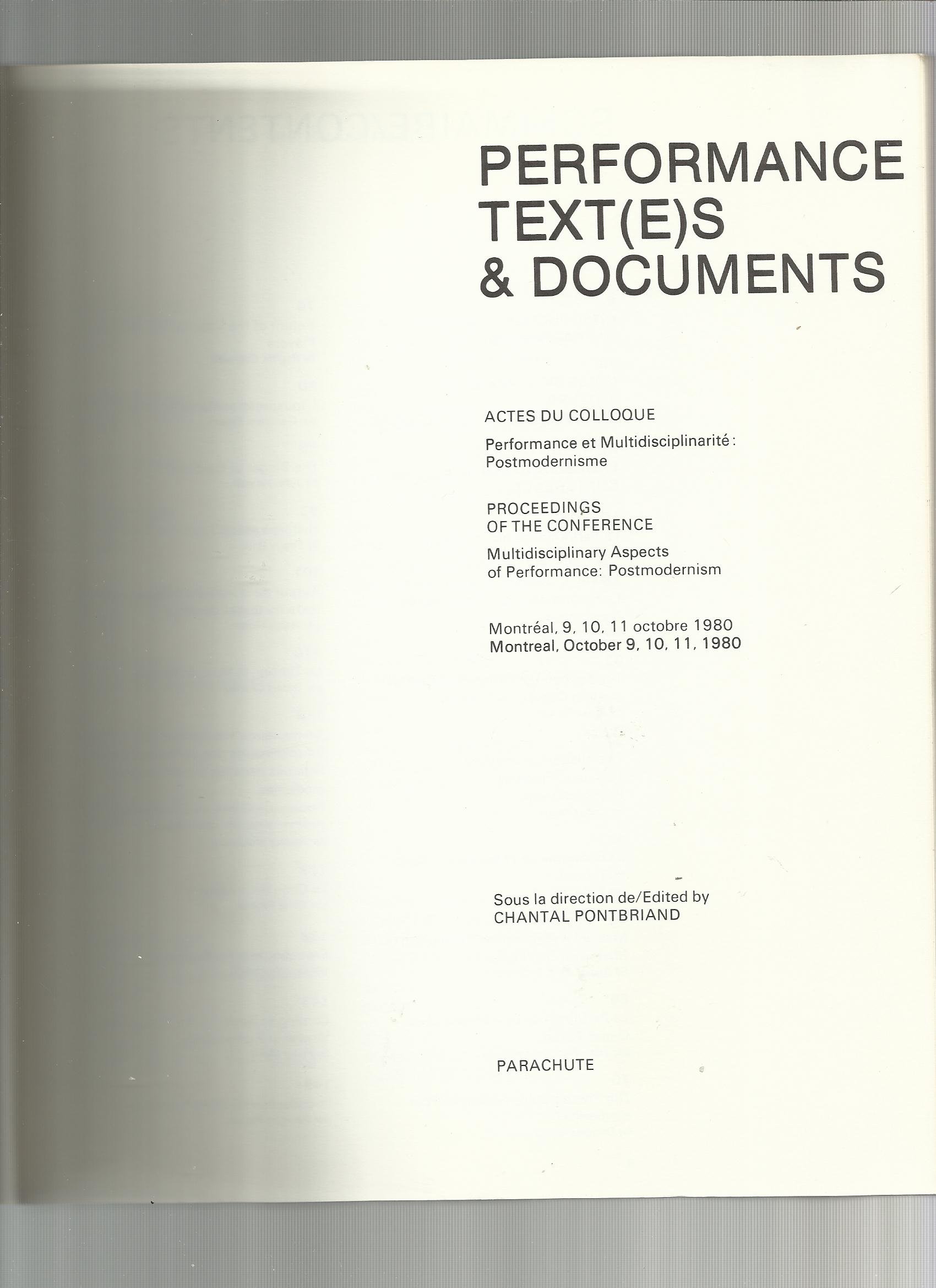 Performance text(e)s & documents: Actes du Colloque Performance et multidisciplinarité, postmodernisme, Montréal, 9, 10, 11 octobre 1980 = ... October 9, 10, 11, 1980