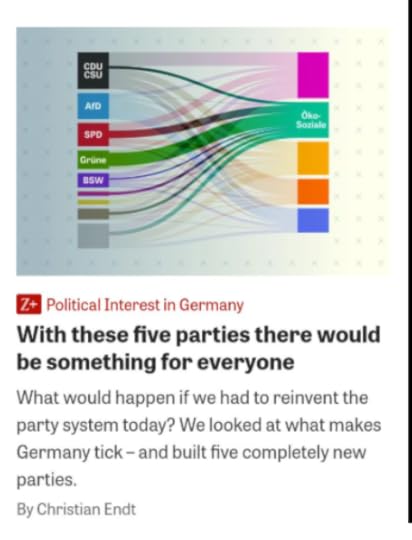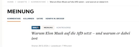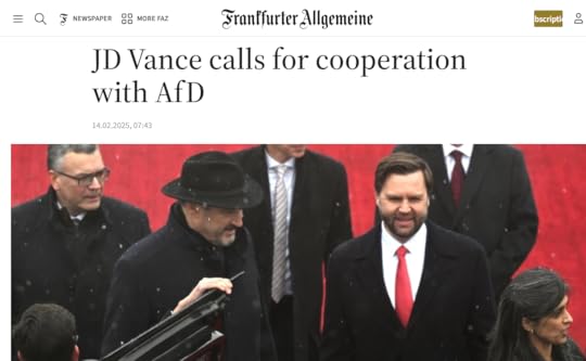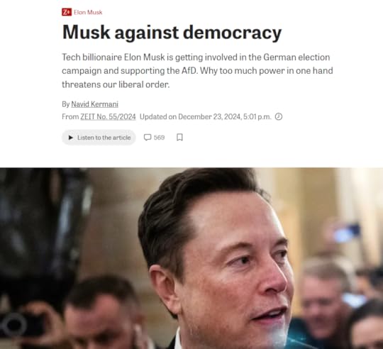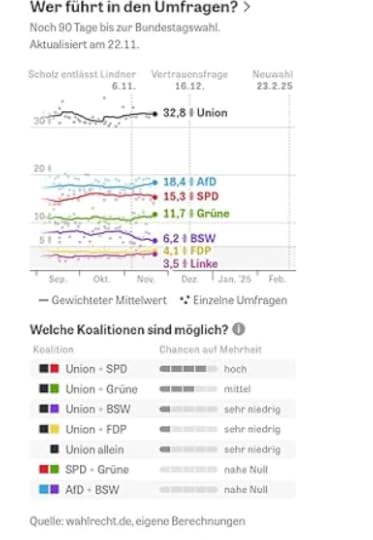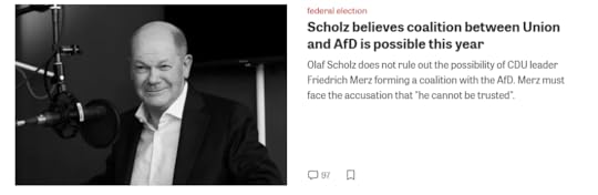 With the imput (some would say "interference") of Elon Musk (on X saying "Only the AfD can save Germany") things may change in the next general election. A tabu may be about to be broken. The unthinkable may get to the fore, I mean, coalitions that were thought to be very unlikely, may turn out to become a reality. A new political realignment in 2025, as never seen before*, may have serious repercussions in all of Europe; especially at the EU level.
