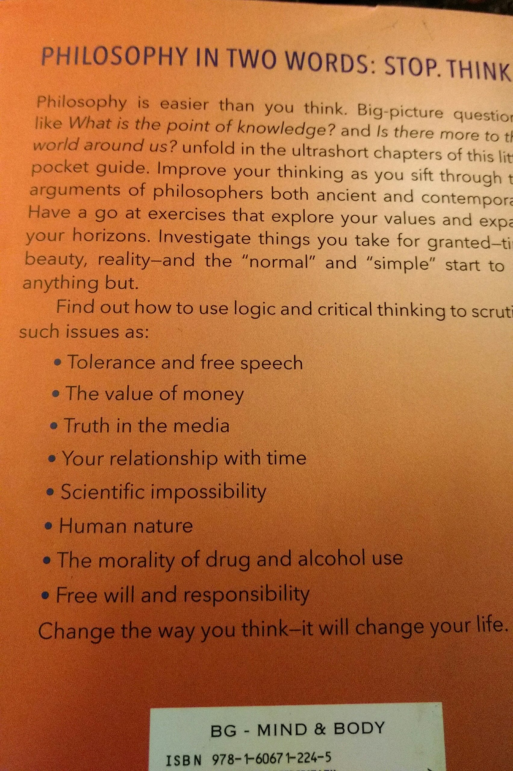 I really enjoyed this book. It is basically a book on how to think. Several of the chapters I found very useful for current events. Chapters like "It's Just Not Fair" and I've Got Rights" are two chapters that are very applicable to people today. The author gives plenty of opportunities to "Stop and Think" on many subjects, which he states as his basic goal.
