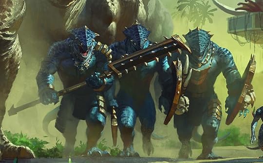 And the lizardmen...if you like lizardmen, then this is not the book for you because they are wimpy af, not to mention dumb as hell. Tell me, who do you think would win in a fight? Three tired, bruised and battered, cut up humans with torn clothes and broken limbs, or these guyshuge, beefy warriors with armored skin and powerful weapons, fresh to the battle? If you guessed the guys in the picture, guess again.