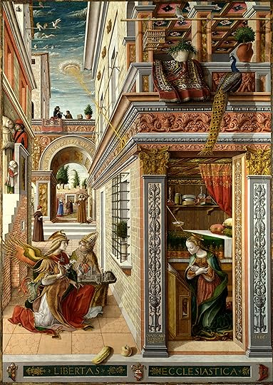 The woman inside the window is the Virgin Mary. Outside, the angel Gabriel greets the Virgin while conversing with St. Emidius, the patron saint of Ascoli Piceno (Crevelli's hometown, which had commissioned the panel), who is holding a "meticulously detailed model of the town he guides. "The client discusses his ambitious town-planning project with his architect -- or so it appears."