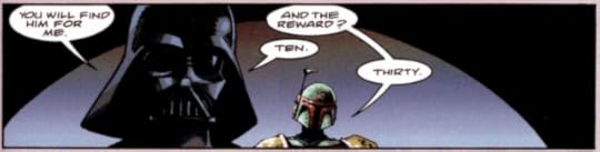 Enemy of the Empire (3/5) - This comic is a little extra, as I have found to be typical of pre-TPM comics. - Fett is hired to find an AWOL Imperial colonel who killed a general. Others are sent to shadow Fett and kill him. All are hired by Vader; no one is allowed to open a casket the colonel carries with him. - What bothers me is how crass some of the language is. One goes "oh, blow--" before being killed. Another is a tattooist who is stopped from saying where someone wanted a tat. - There is a photo booth. - Some flashbacks are difficult to separate from the main story. - Icarii love their gold, and I wonder if that's a dig at the Inca. - The Vader vs. Fett fight was a bit lame