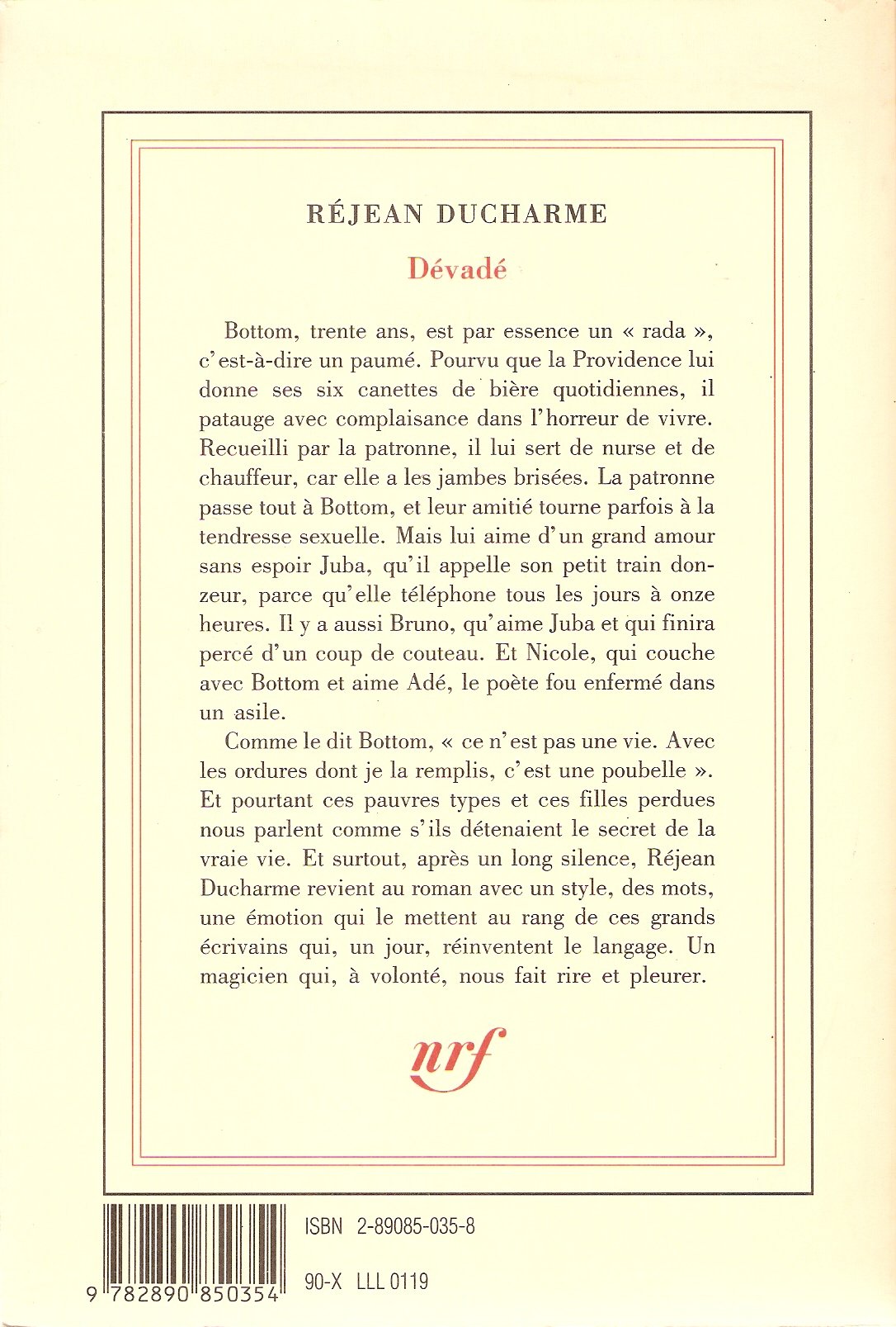 Bottom, trente ans, est par essence un "rada", c'est-à-dire un paumé. Pourvu que la Providence lui donne ses six canettes de bière quotidiennes, il patauge avec complaisance dans l'horreur de vivre. Recueilli par la patronne, il lui sert de nurse et de chauffeur, car elle a les jambes brisées. La patronne passe tout à Bottom, et leur amitié tourne parfois à la tendresse sexuelle. Mais lui aime d'un grand amour sans espoir Juba, qu'il appelle son petit train donzeur, parce qu'elle téléphone tous les jours à onze heures. Il y a aussi Bruno, qu'aime Juba et qui finira percé d'un coup de couteau. Et Nicole, qui couche avec Bottom et aime Adé, le poète fou enfermé dans un asile.Comme le dit Bottom, "ce n'est pas une vie. Avec les ordures dont je la remplis, c'est une poubelle". Et pourtant ces pauvres types et ces filles perdues nous parlent comme s'ils détenaient le secret de la vraie vie. Et surtout, après un long silence, Réjean Ducharme revient au roman avec un style, des mots, une émotion qui le mettent au rang de ces grands écrivains qui, un jour, réinventent le langage. Un magicien qui, à volonté, nous fait rire et pleurer.