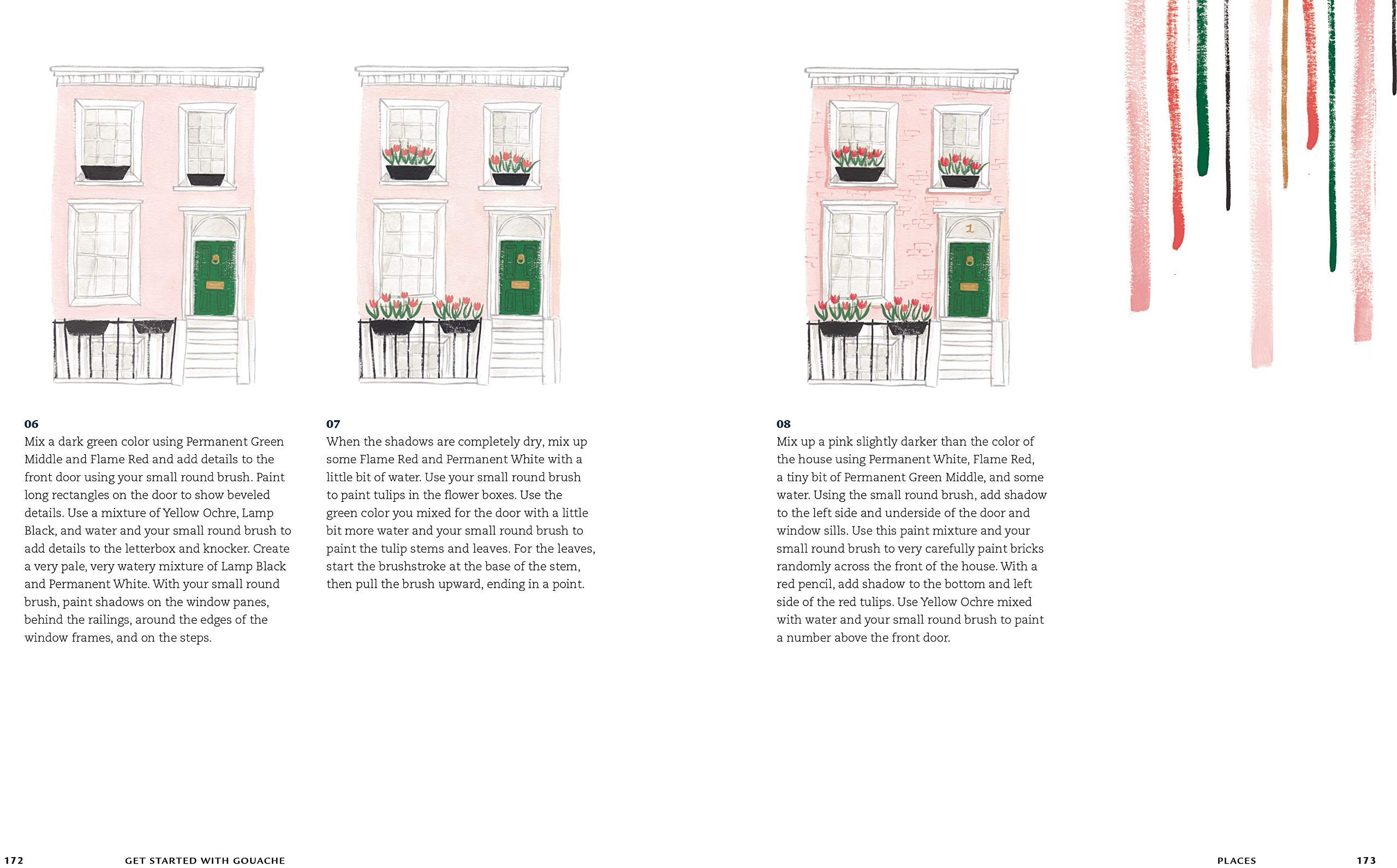 This book is great as a reference and for trying out the techniques and tips using the step by step exercises that are provided. The exercises are simple and easy to duplicate. If you don’t have any tubes of gouache, her palette is a good starting point. I have my own color preferences so I used my own paint when I wanted to try out a technique or exercise.