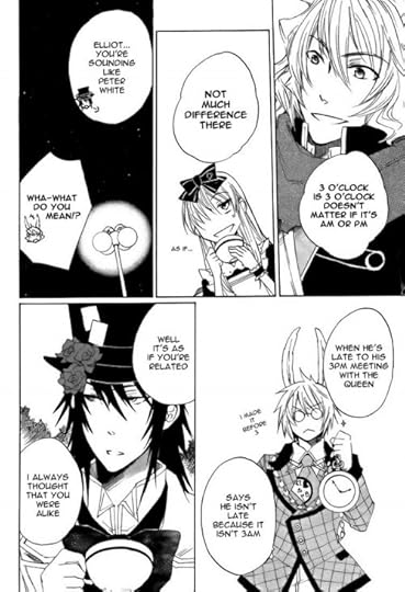 As for the other characters, I think my favorite in this volume was Elliot. His interactions with Alice, like when he was explaining he's not a rabbit because he only likes things MADE out of carrots, not raw carrots, or when Alice couldn't help but pull his ears and snuggle with them, making him just adorable. An adorable mafia killer, but still, adorable. His duel with Peter makes me laugh, too. He truly seems to like Alice.