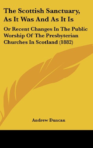 The Scottish Sanctuary, As It Was And As It Or Recent Changes In The Public Worship Of The Presbyterian Churches In Scotland is a book written by Andrew Duncan in 1882. The book provides a comprehensive overview of the changes that have taken place in the public worship of the Presbyterian Churches in Scotland. It highlights the historical context of these changes and how they have impacted the religious practices of the Scottish people. The book also discusses the role of the church in Scottish society and how it has evolved over the years. The author provides an in-depth analysis of the different aspects of Scottish worship, including the use of music, liturgy, and preaching. The book is an important resource for scholars and students of religious history, as well as anyone interested in the evolution of Scottish culture and society.This scarce antiquarian book is a facsimile reprint of the old original and may contain some imperfections such as library marks and notations. Because we believe this work is culturally important, we have made it available as part of our commitment for protecting, preserving, and promoting the world's literature in affordable, high quality, modern editions, that are true to their original work.