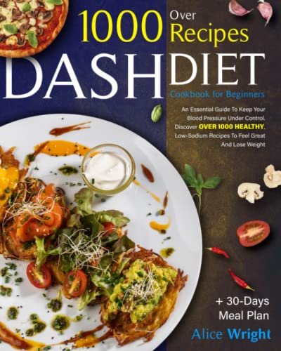 DASH DIET COOKBOOK FOR BEGINNERS : An Essential Guide to Keep Your Blood Pressure Under Control. Discover Over 1000 Healthy, Low-Sodium Recipes to Feel Great and Lose Weight + 30-Days Meal Plan by Alice Wright This book starts out with table of contents where recipes are listed as meals and food categories. Introduction discusses the diet itself, foods to avoid and foods allowed along with servings per day and those to avoid. Benefits and tips to succeed are included. 21 day meal plans. Each recipe starts with a title, prep and cook times and servings. List of ingredients and you should be able to substitute for your healthier dietary needs: low fat, low sodium, low sugar and fresh vs canned items. Some contain a LOT, be sure to have them all first. Directions are given and some nutritional information: calories, fat, carbs, protein, cholesterol, sodium, potassium are listed, NOT sure of serving size. One recipe wants you to place sheet in preheated oven, but never tells you the temperature. Read recipe all the way through. Very few recipe pictures. Some recipes nutritional information only has calories, fat, carbs and protein listed, hmmm