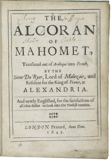غلاف أول ترجمة انكليزية كاملة للقرآن ظهرت عام 1649 ترجمها عن الفرنسية ألكساندر رس، الذي كان لا يتقن العربية. كانت الترجمة رديئة وفظة، ولكنها بقيت الوحيدة مدة 85 سنة حتى ظهر غيرها. وقد تزامن نشرها مع انتشار القهوة في انكلترا والتي سموها "حبوب المحمديين"، فسحر الناس بها، مما جعل بعض مثقفيهم يشعرون بخطرها الثقافي، فكتبوا: (ما إن بيعت القهوة عندنا، حتى ظهر القرآن بيننا)، داعين لتجنبها، لأنها تدخل قلب الانكليزي فتجعله معجبا بالإسلام ومستعدا للتحول إليه.ه