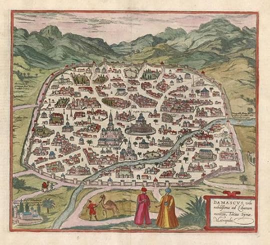 - كانت دمشق مهمة جدا في فكر عصر النهضة وأعجوبة في نظر البريطانيين؛ لأنه كان ينظر إليها كمدينة نموذجية ومكان يمكن أن يكون مثالا تحتذيه المدينة الأوروبية، وهذه خريطة لدمشق من القرن السادس عشر من كتاب Civitates Orbis Terrarum by Franz Hogenberg and Georg Braun
