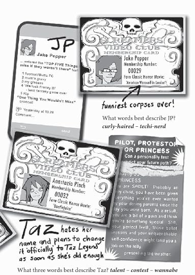 But it was Scarlett Dedd’s quirky and hilarious plot that captured me. The way that Scarlett accidentally managed to kill herself and her family was brilliant. Unfortunate and a little nasty, but brilliant. And then you’ve got a varied and distinctive cast of supporting characters: her solitary, struggling novelist dad; scatty, French mum; gross little brother and gothic, horror movie-obsessed friends, Rip, Psycho, JP and Taz. They were so awesome that I kind of understood why she tried to kill them so she wouldn’t have to miss them. Especially Rip’s insults like “walking liposuction accident” and “oozing plague-spot”. Genius!