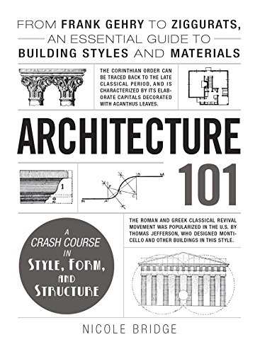 Architecture 101: From Frank Gehry to Ziggurats, an Essential Guide to Building Styles and Materials is a broad but shallow overview of architectural history. The cover illustrations suggest that the text will be accompanied by explanatory line drawings, but there are very few; and the few there are are not clearly labeled. Read this book with your phone, tablet, or laptop in hand so you can Google architects and building styles as you go.