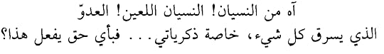 " أبنائي لم يأتو لزيارتي منذ وقت طويل ،، إلا إذا نسيت ،، أجل ،، أنا أنسى ،، ما أقسى أن يفقد الإنسان ذاكرته ! والغريب هو أن أحداثا قديمة تتوارد إلى ذاكرتي وكأنها نابعة من أماكن قصية "