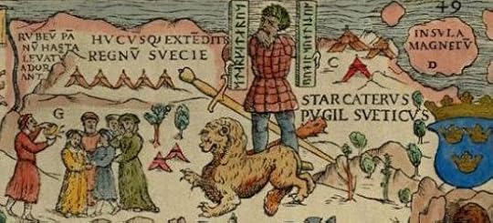 Starkad, the legendary hero from Norse mythology, from the part of the map depicting the vague locations of magnetic north; taken from 'Carta Marina' drawn by Olaus Magnus circa, 1530s.
