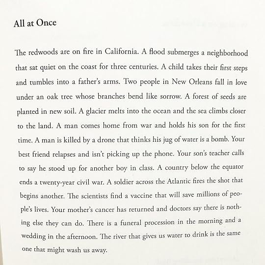 Everyone hears about how much it changes you, your prioritizes, your thoughts and worries, and all the other cliches parents talk about and before it happens to you its easy to dismiss that. But if it you do become a parent, you realize that these things are often true, but usually in a way that seeps into you and seems ineffable. Luckily we have poetry, a wonderful way to still definite the shape these elusive feelings and there are so many moments here where I thought “yes, Clint Smith, wow, yes thats it exactly. I love his poem about discussing poetry with his child, telling them poetry is in them and ‘searching for something to tell you / that you are what you have always been to me.’ There were many moments here where I’d smile and nod, knowing all too well what he is saying. Like this one: