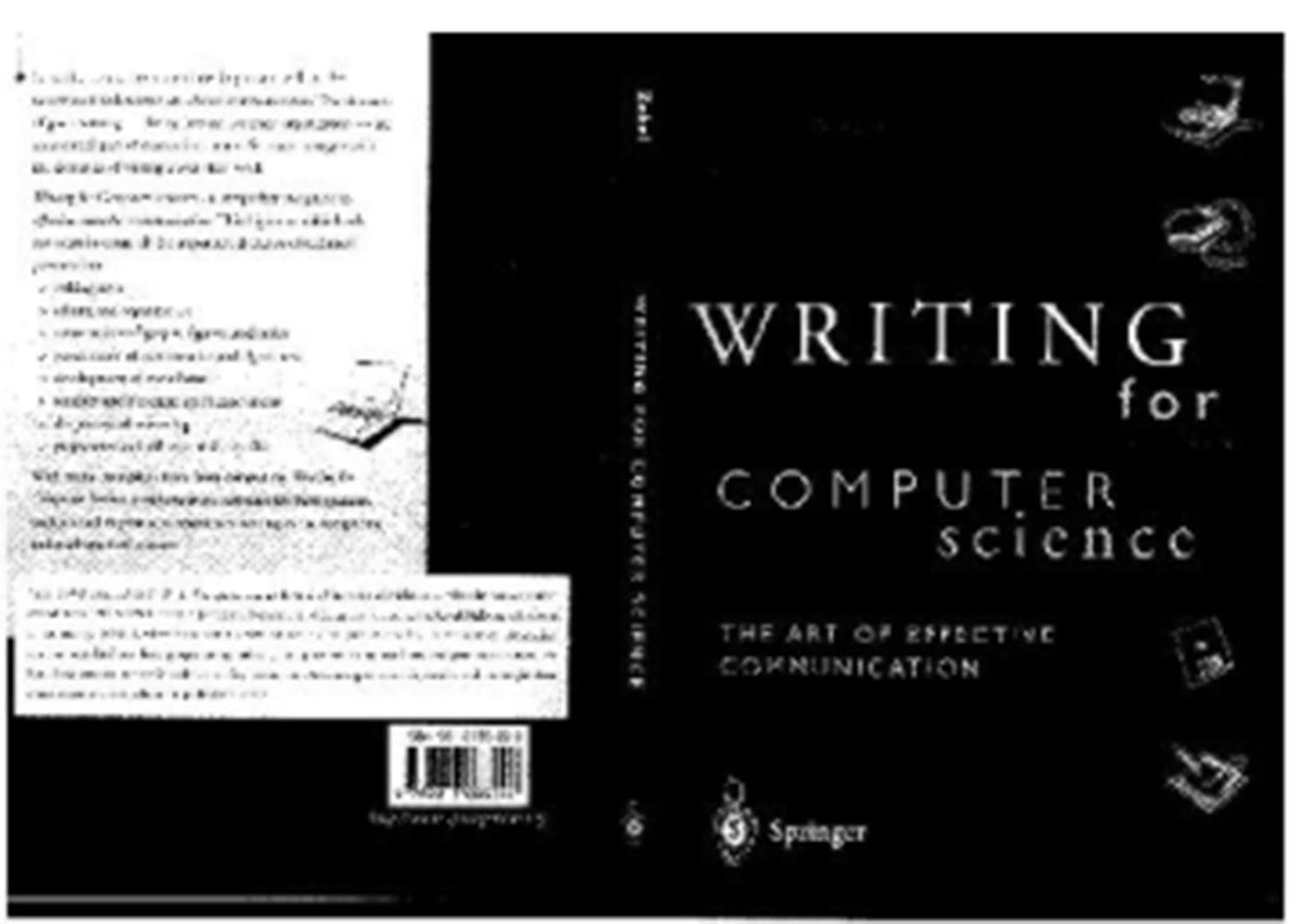 As it says in the title, a book about writing for Computer Science; or more specifically writing papers in Computer Science. The book gives general advice on writing and specific advise on writing and formatting papers. There are also four chapters included that talk more general about good practises in research, ethics, and presentations.
