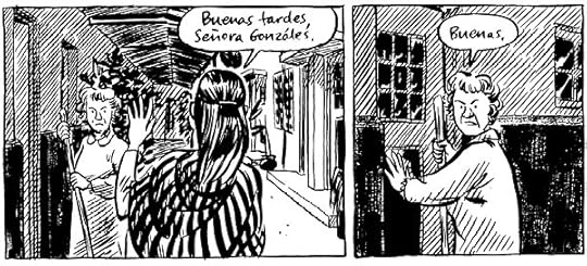 All of this works and the art reinforces that. Abel uses a clean black and white “cartoony” style, but there is energy and movement in how the panels depict the heated arguments and frenetic partying. She also draws fantastic representations of various sites in Mexico City. She mostly uses a straight-forward six-panel per page layout, which means when she does break into larger panels it effectively displays the importance, breadth or majesty of what is being depicted. The only time her artwork fails is not because of the drawing itself, but because later, when most of the action takes place in Carla's little apartment where she obsessively follows a kidnapping story in the newspapers, it starts to feel static and repetitive. While I think it does serve to demonstrate Carla's relative isolation during this time, Abel might have done more with the text and narration to make it more engaging.