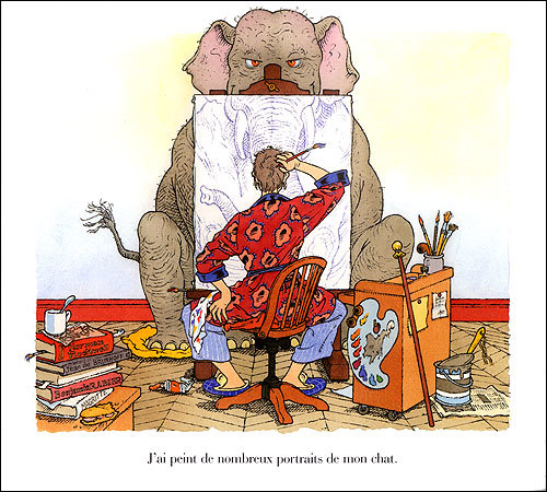 Okay, so you can tell by the cover that there's an elephant, not a cat, right? Well, throughout this whole book, he's talking about his cat as if he has no clue that it's actually an elephant. And the elephant acts like a cat.