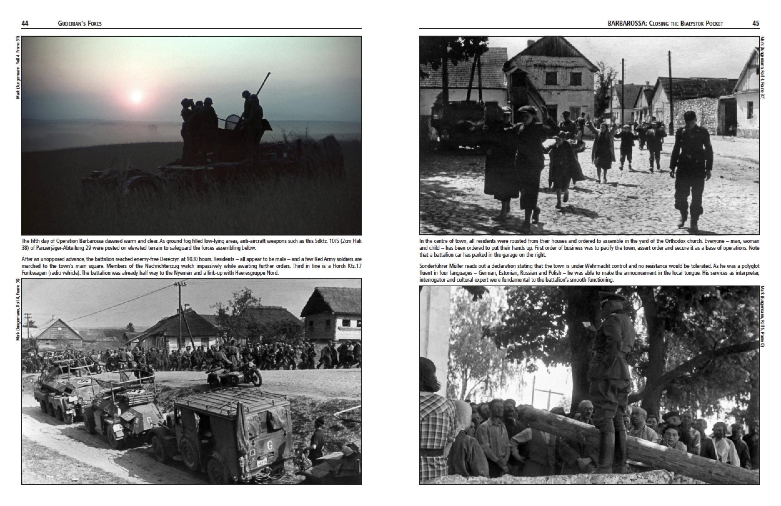 Prior to Operation Barbarossa, the men of Aufklärungs-Abteilung 29, elite recon soldiers of the motorised 29. Infanterie-Division with several campaigns under their belt, emblazoned their vehicles with a creeping fox insignia, a seemingly apt emblem because they, too, were cunning, stealthy and observant. Yet once the campaign was in motion, it became apparent that gathering intelligence was closely connected with combat and casualties. But that was in the future. Before crossing the border into the Soviet Union and in the heady opening days of the campaign, they imagined they would always be out in front, sniffing a way forward, tracking their foe, feeling him out, yet avoiding confrontation. They would be foxes. Guderian’s foxes. Uniquely positioned on the staff to capture the battalion’s exploits was Gefreiter Karl Jungermann, a reluctant soldier whose father owned a photo shop. With access to film stock and processing facilities, Jungermann became the unit’s photographer. After returning ill from the Eastern Front in April 1942, he created a photographic report, in reality a “sales catalogue”, which his comrades could browse and use to order prints. Jungermann’s voluminous archive – original negatives, colour slides, the well-thumbed photographic report, stacks of individual photos and his diaries – forms the basis of this volume, all of it scrupulously researched, cross-checked and expanded using the war diaries of his parent division and supplemented with images from other sources. 280 x 216 portrait format 370 pages on high-quality gloss paper Hardcover only 658 photos (549 black-and-white and 109 colour) 21 maps and sketches 6 colour armour profiles