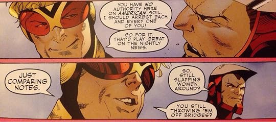 Next: Hey, Quicksilver, that wasn’t your sister, that was Loki, in drag! Which leads to some ill-will and choice words.